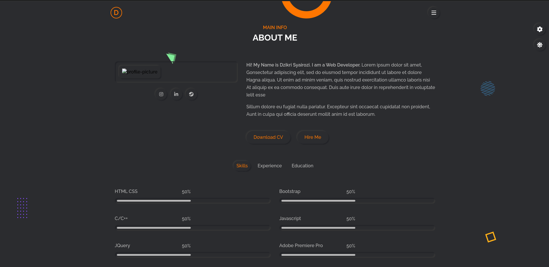 - About Me section, because i dont know how to create a page, i decided to use visibility feature for its section.